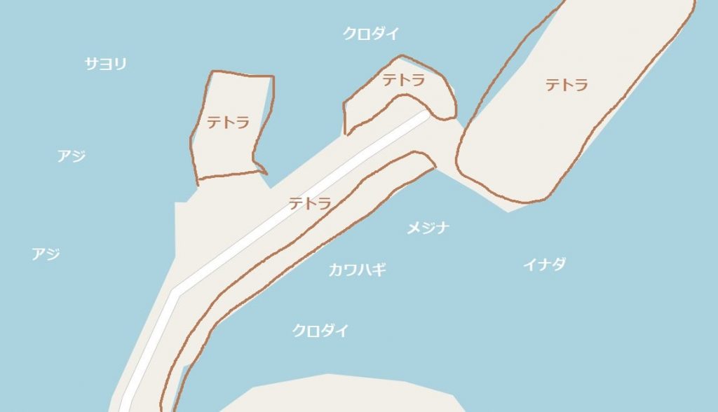 内側のテトラでは、ウキフカセ釣りでメジナ、クロダイが狙え、春先にはサヨリも混じります。
