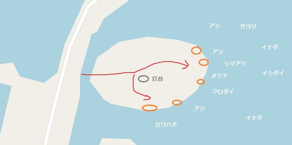 先端もしくは、内側での釣りになるでしょう。
