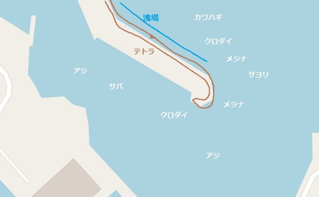 外側は先端以外は水深が浅く、釣りになりません。